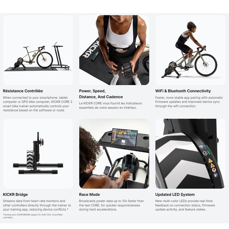 As novas funcionalidades incluem o modo Race, que fornece dados de potência dez vezes mais rápidos do que a versão anterior, ideal para competições online. O WiFi integrado garante uma ligação estável, actualizações automáticas e uma maior compatibilidade graças ao KICKR Bridge. Por fim, o novo sistema de LED multicolorido facilita a leitura do estado das ligações e das actualizações, garantindo uma utilização sem preocupações.